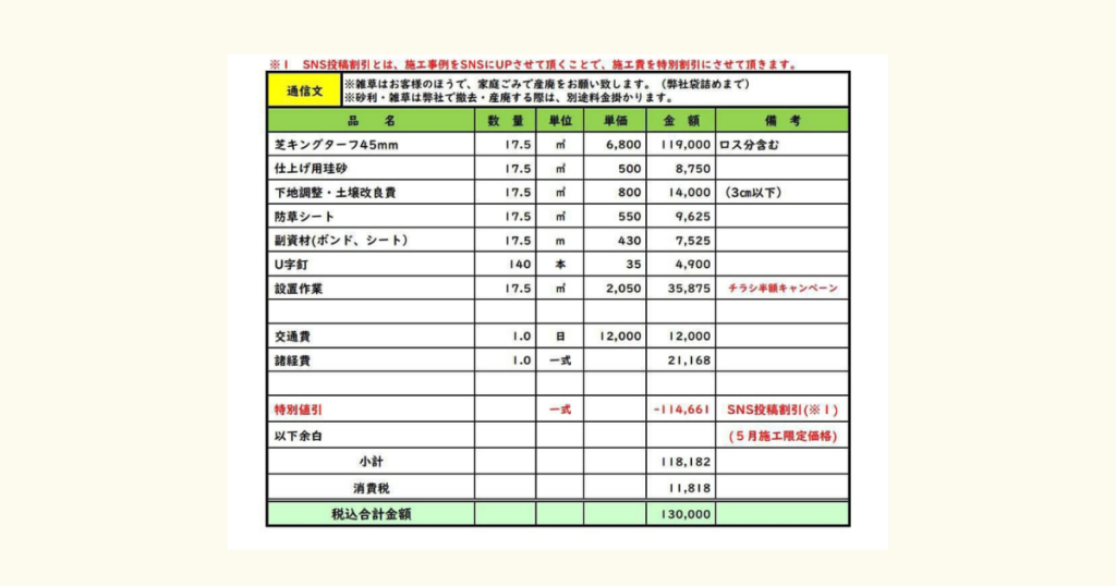 外構業者の見積もりよりも安く抑えられた最大の理由は、専門店への直接依頼と、この大幅な特別値引きにあります。